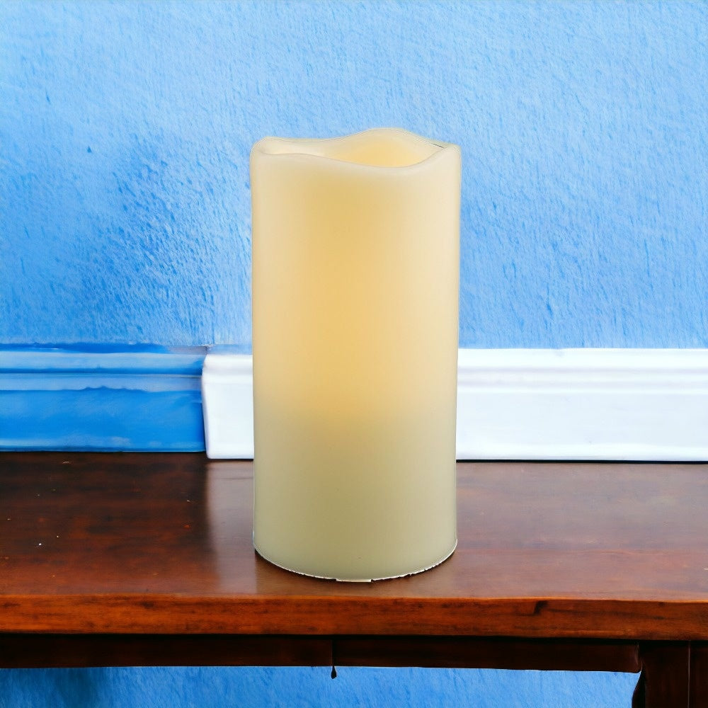 Transform your space with the radiance of this 6-inch ivory flameless indoor outdoor pillar candle. The classic shape makes this pillar candle a versatile addition to any decor style, whether it's traditional, contemporary, or modern. The flickering feature is designed to create an authentic candlelight experience. Let the warm glow of candlelight create an intimate and welcoming ambiance for your guests or a soothing atmosphere for yourself. 5.75-inch H x 3-inch W x 3-inch D