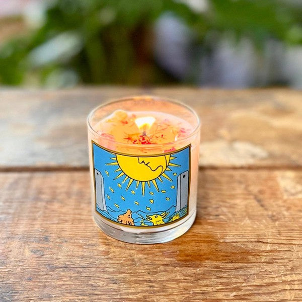 INGREDIENTS Cotton wick, GMM-free soy wax, organic coconut oil, proprietary blend of organic essential oils, botanicals, & mica encasing a crystal charged under the full moon..