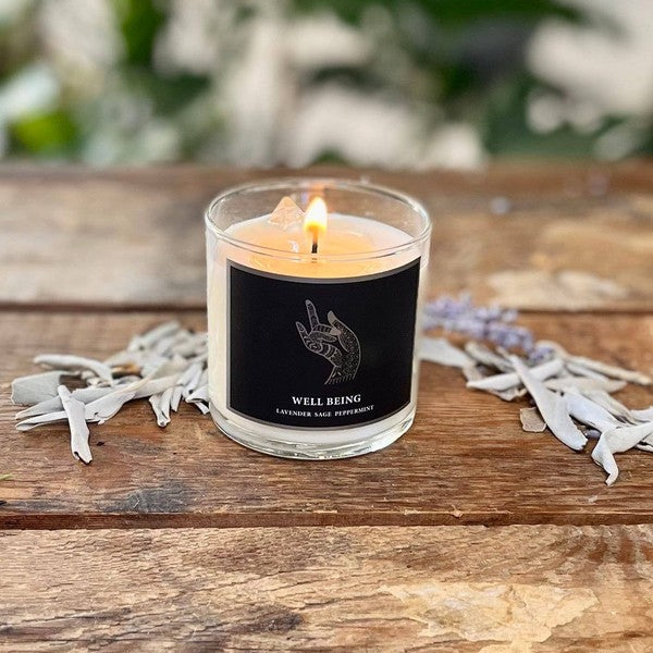 Non-gmm soy wax, organic coconut oil, organic essential oils: Lavender, Sage Peppermint & Basil, encasing a crystal charged under the full moon