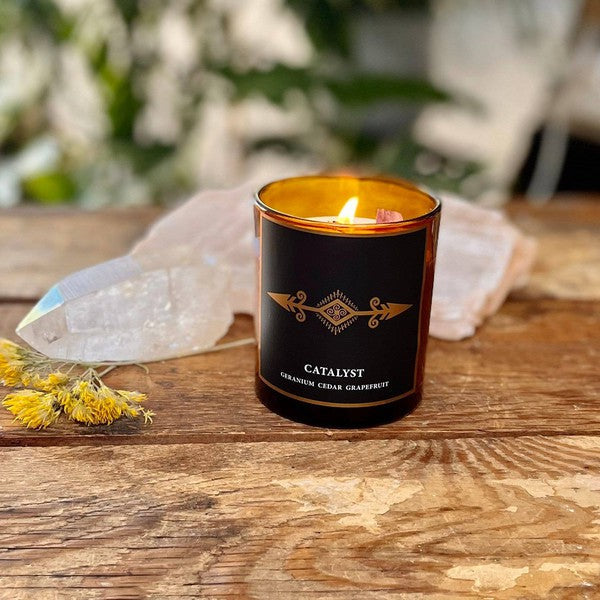 INGREDIENTS Cotton wick, GMM-free soy wax, organic coconut oil, proprietary blend of organic essential oils, botanicals, & mica encasing a crystal charged under the full moon. .