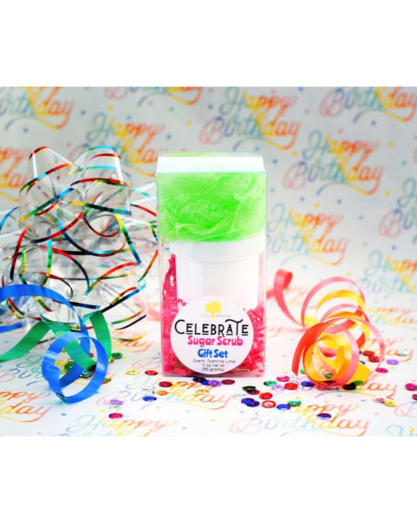 Gift sets include 3 oz sugar scrub and assorted color mesh sponge
