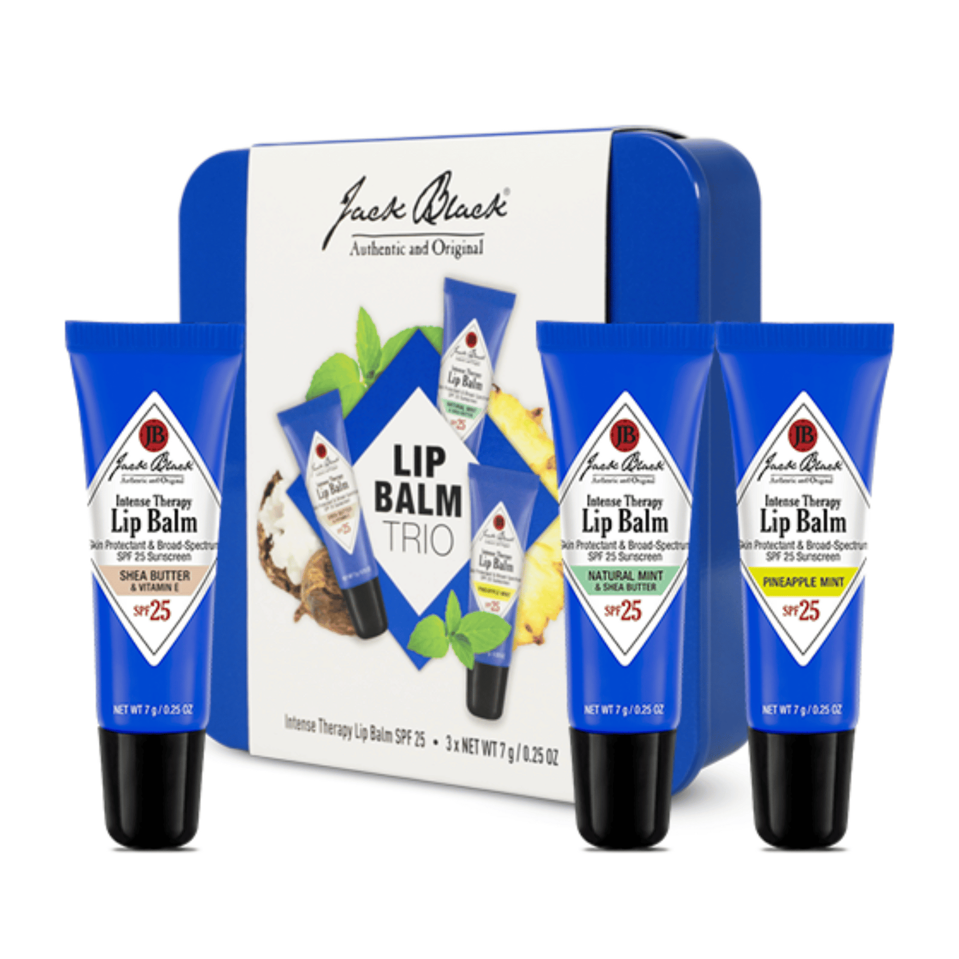 A trio of soothing Intense Therapy Lip Balms SPF 25 featuring award-winning flavor favorites and new Pineapple Mint. Packaged in an exclusive reusable, recyclable Jack Black® tin, this is a gift–for yourself or someone else–that lasts long after the lip balms are gone.