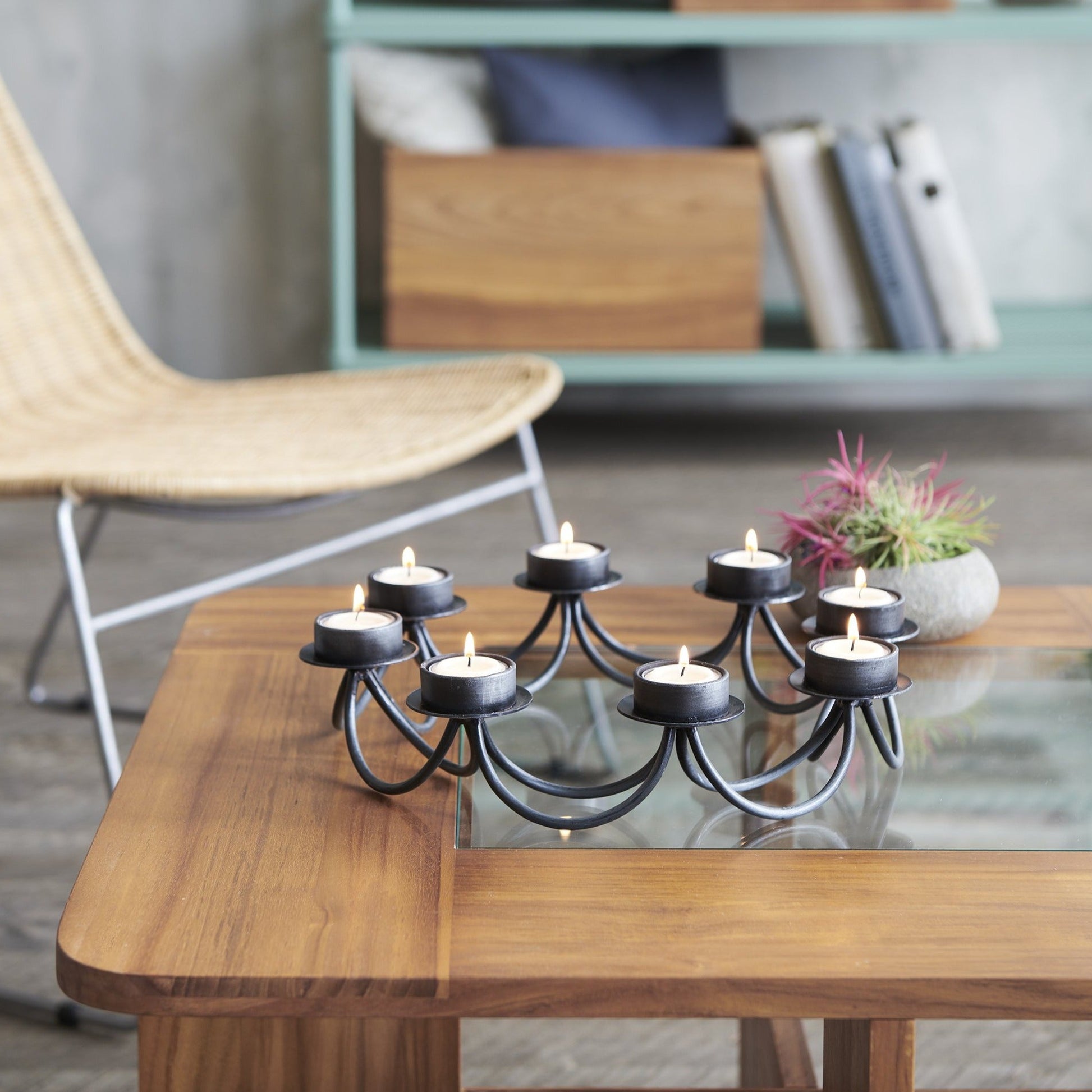 These blackened steel and wrought iron candle pieces are an elegant adornment for a table, mantle or sideboard. Add your own creativity by weaving a flora or ribbon garland through the pleats of metal to dress the piece appropriately for special occasions.