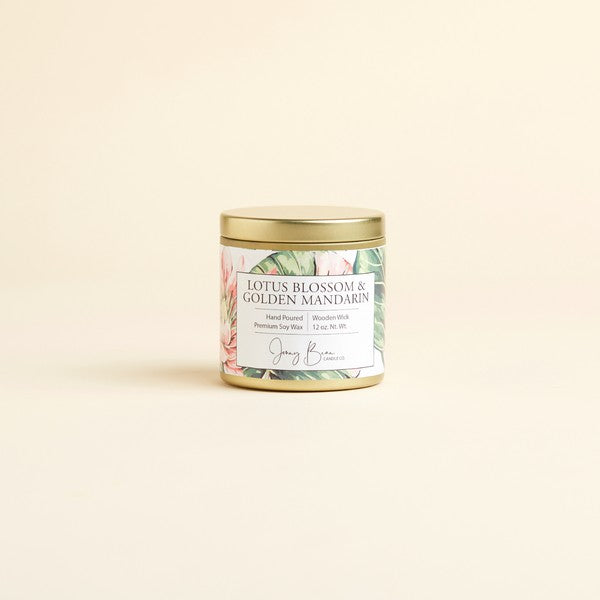 12oz Nt. Wt. I Soy Wax I Wooden Wick I Gold Tin w/ Lid 4"diameter x 4" high