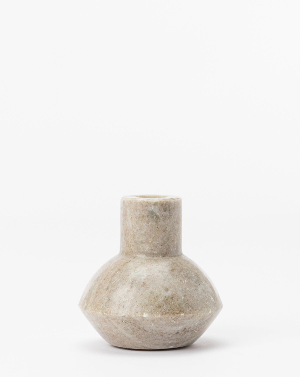 Function follows form in the Marble Shaped Taper Holder. Its softly tapered shape is crafted from marble, giving visual weight to this simple yet elegant design. Beige marbling swirls through the piece to create movement across its softly rounded surface, making it a beautiful complement to the tall, slender candles it holds.