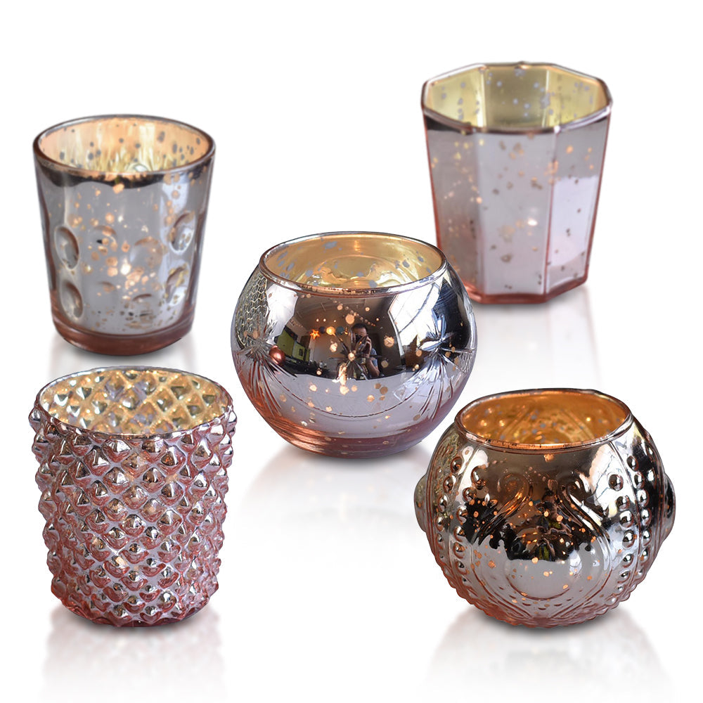 Shabby Chic Rose Gold Mercury Glass Tea Light Votive Candle Holders (Set of 5, Assorted Designs and Sizes)