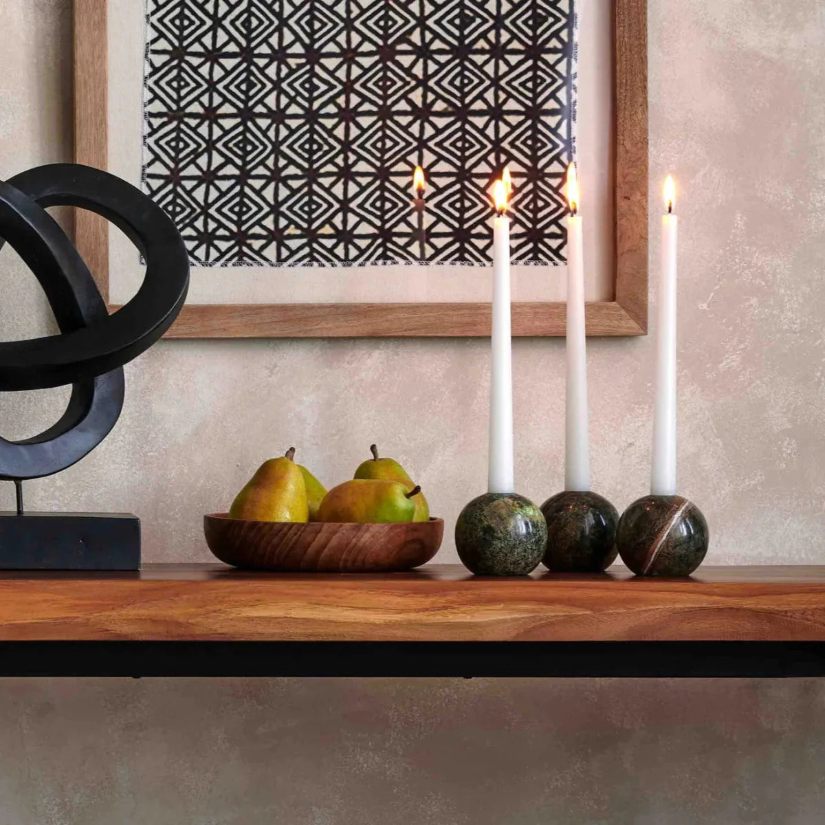 We love the incredible veining of the Rajasthani marble. Each piece we craft has tones of greens, browns, reds, and grays. The colors will vary from piece to piece due to the natural materials and irregular veining of the marble. Add these taper holders to your home décor, maybe even enjoy a candlelit dinner with the help of the piedmont taper holders!. Candle not included.
