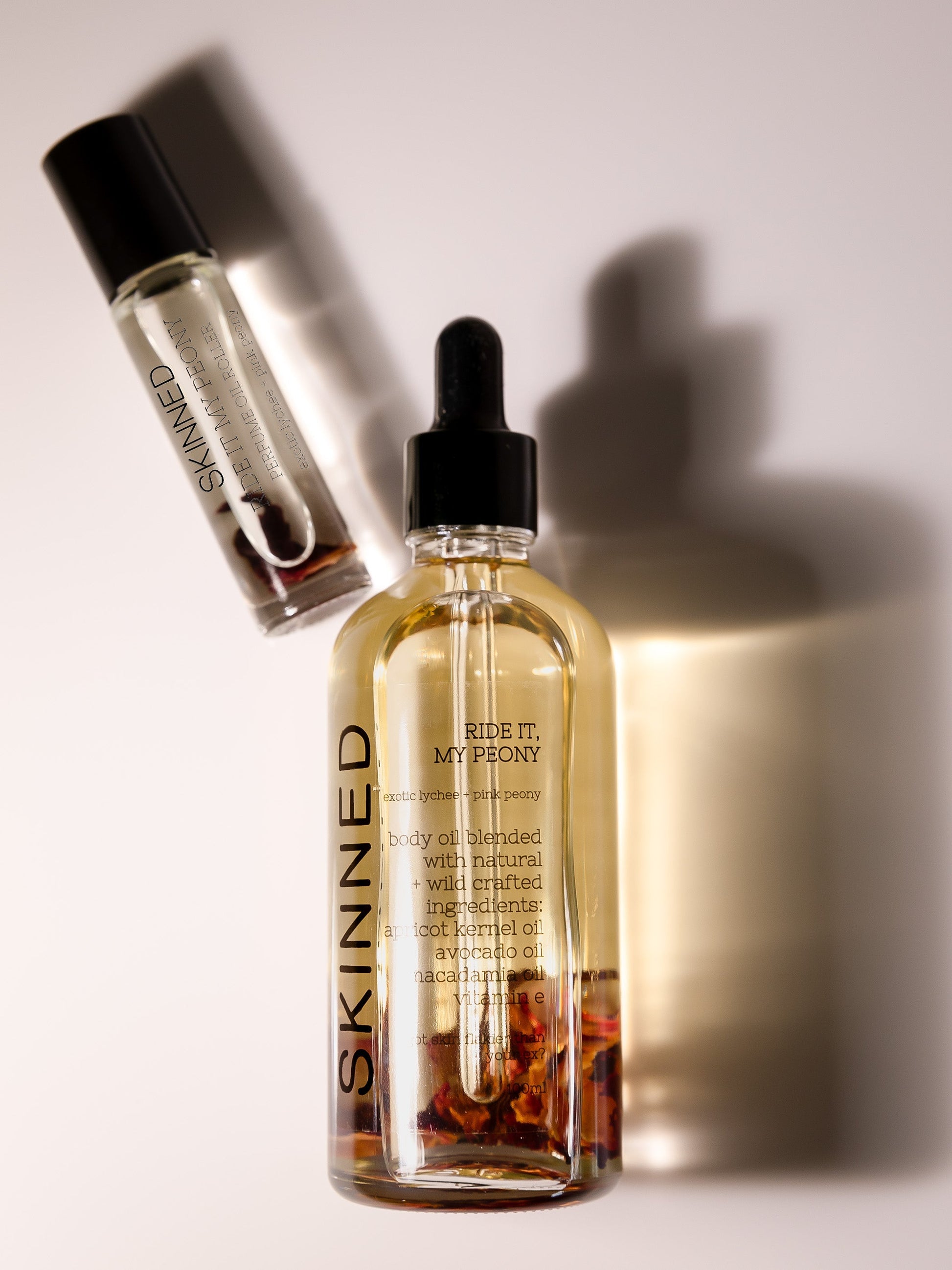 Ride It, My Peony Body Oil and matching Ride It, My Peony Perfume Oil Roller.
