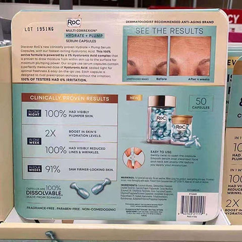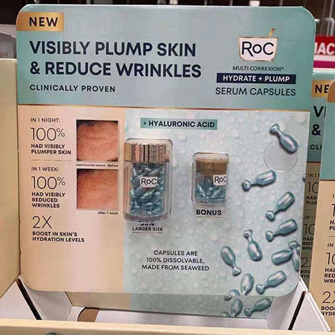 Discover the benefits of RoC’s new clinically proven Hydrate + Plump Serum Capsules with our fastest-acting Hyaluronic acid. These dermatologist-tested firming serum capsules are formulated with a perfectly measured dose of Hyaluronic Acid, which is proven to draw moisture from within the skin up to the surface. Our Hyaluronic Acid serum has maximum plumping power. These intensive hydrating serum capsules are clinically proven to plump skin in one night, reduce lines and wrinkles, and double the skin’s hydration levels in one week. This skin plumping serum also firms the skin in four weeks. Our 100% biodegradable wrinkle serum capsules are sealed tight for optimal freshness and are easy to use on-the-go.