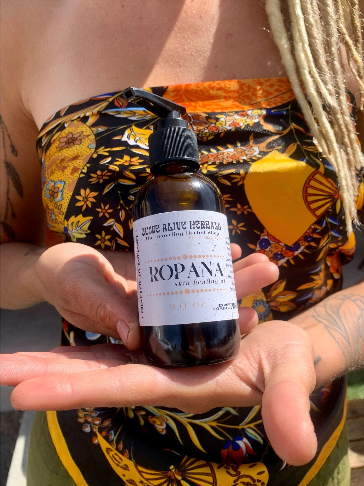 Ropana is Sanskrit for healing. This infused oil is crafted to support skin conditions like eczema, psoriasis, and severely dry skin.