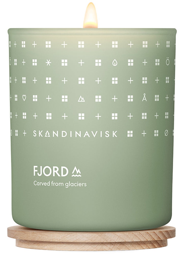 Skandinavisk Fjord Scented Candle is a perfume and Swedish rapeseed wax blend in painted glass with a pure cotton wick and engraved beechwood lid. The local Swedish rapeseed wax is sustainably farmed, traceable and non-GMO for the lowest environmental impact.