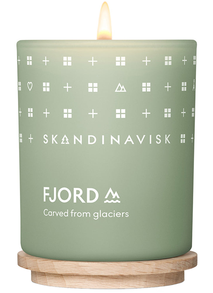 Skandinavisk Fjord Scented Candle is a perfume and Swedish rapeseed wax blend in painted glass with a pure cotton wick and engraved beechwood lid. The local Swedish rapeseed wax is sustainably farmed, traceable and non-GMO for the lowest environmental impact.