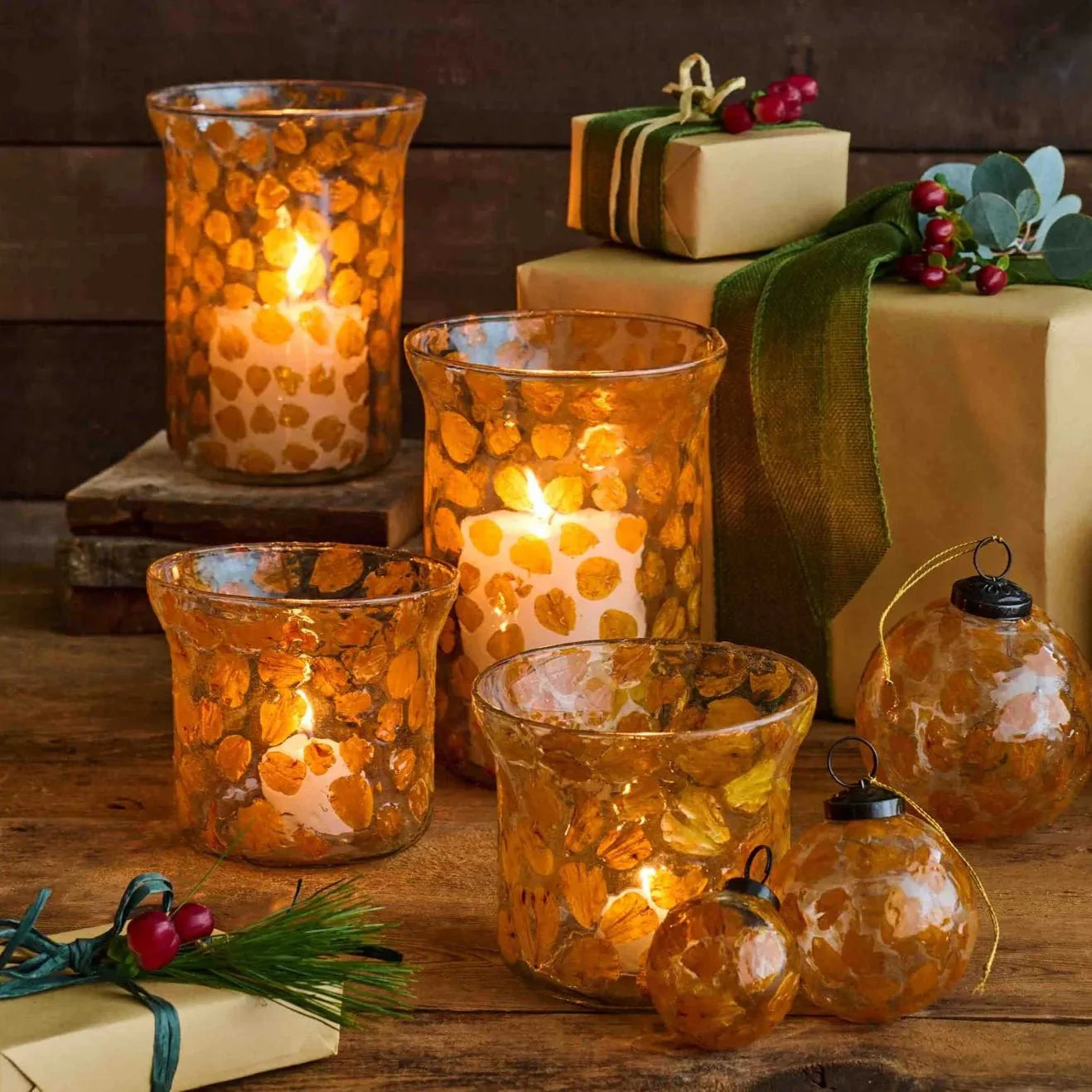 These Souci ornaments take their color from the petals of the marigold flower that we carefully fuse one by one on the inner surface of the mouth blown glass ornament or hurricane. The swirling petals appear almost as if they were miniature autumn leaves blown about by the wind.