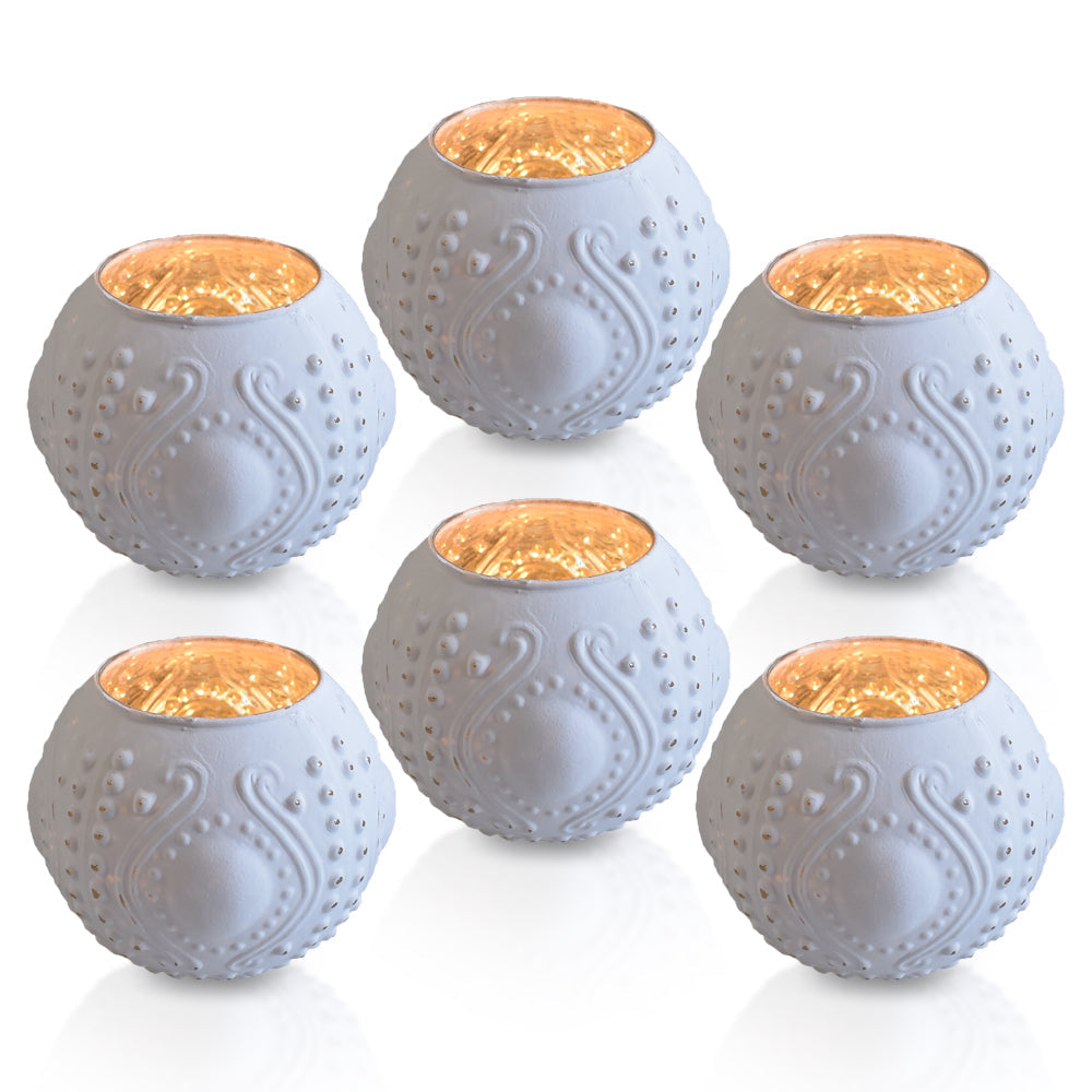 This set of 6 rounded mercury glass candle holders has a henna design that will be sure add the correct accent to your holiday or wedding reception tables! Small - 4.25-inch diameter x 3.25-inches high. Not for food use - recommended to use with a battery operated or real tea light.